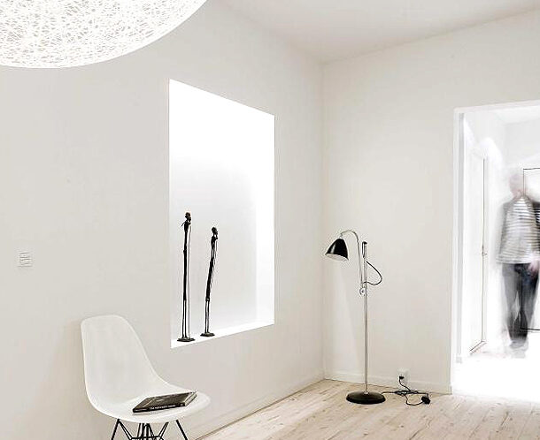 Norm Architects deliver a home fit for living, breathing, relaxing and displaying few but well chosen pieces of art… Loaded with nooks and niches that bring great emphasis to whatever highlights that particular spot…much like an art gallery. It is sparse and spare, a veritable kingdom for minimalists, but it also looks comfortable with the flourishing contemporary fireplace. Custom recessed lighting highlights chosen areas, whilst a glossy handle-less kitchen sticks to the highly unfussy theme but provides plenty of shelving and cupboard space to hide nic nacs and essentials. Plenty of light wood against white takes me back to beloved …