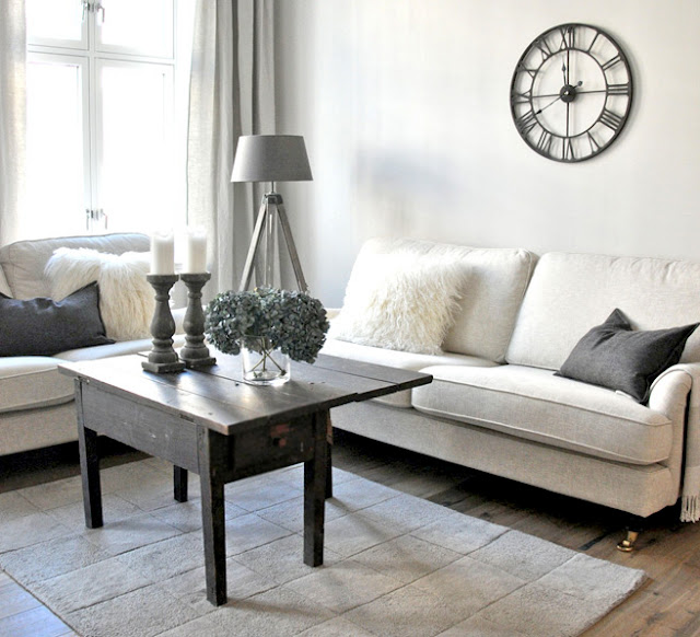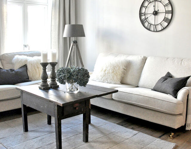This is such a simple do-able space. The rickety vintage table. One of our enduring favourites the giant steeple clock. A simple sofa with some well chosen throws and cushions. Not flashy 0r splashy but oodles of character. Check out also the vintage feel candle sticks and the in-character tripod lamp.