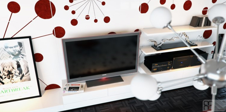 I just think this is a really effective idea. I don’t know if I want to live in it, but the design is so brazen it defies you to dislike it. I  rather like that it is carried on via the rug and although the pattern is quite distracting it sits just so so with the eye enough for it not to disturb the TV viewing…j-u-u-ust about!