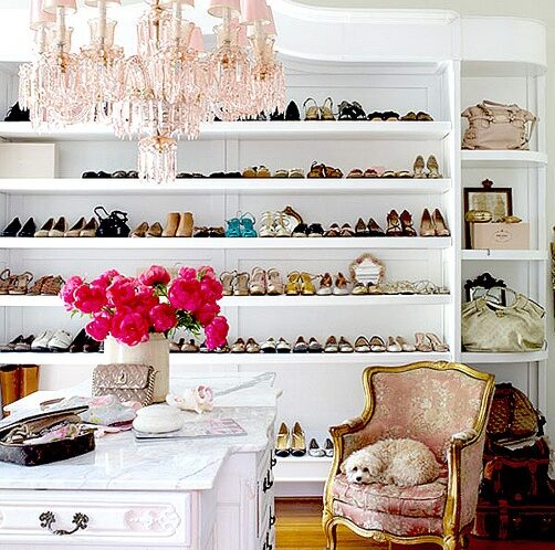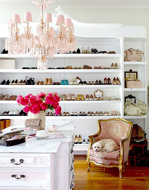 I know a lot of women who would sell a lock of hair to acquire this frilly pink and white closet. The Louis XVI style pink brocade chair, the pink hanging pendant light and the endless shoe collection and it’s grand housing…breathe…just breathe! Long deep breaths…come on now! You can do it!