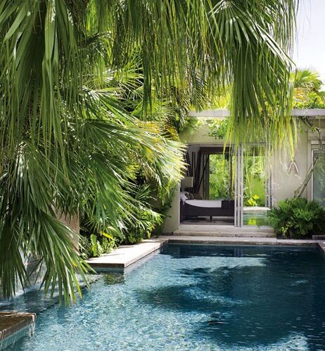 Welcome to novelist Judy Blume’s sensational Florida pad. The 2,500 ft dwelling is open and mouth wateringly green and fresh. Indeed it was the exotic gardens that enticed her to buy the property with her husband. These wonderful shots from Architectural Digest reach out and sock you in the face with green and white, the two colours of freeeeeesh-ness, (plus a little swimming pool blue).