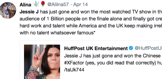 Jessie J has just gone and won the most watched TV show in the world with an audience of 1 Billion people on the finale alone and finally got credited for all her hard work and talent while America and the UK keep making irrelevant people with no talent whatsoever famous* https://t.co/ayYpVGSr7Q