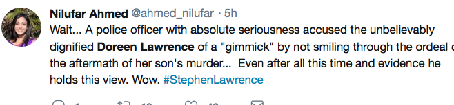 Wait… A police officer with absolute seriousness accused the unbelievably dignified Doreen Lawrence of a "gimmick" by not smiling through the ordeal of the aftermath of her son's murder… Even after all this time and evidence he holds this view. Wow. #StephenLawrence