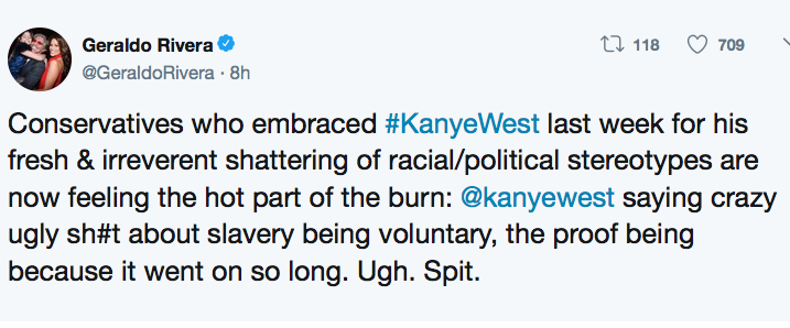 Conservatives who embraced #KanyeWest last week for his fresh & irreverent shattering of racial/political stereotypes are now feeling the hot part of the burn: @kanyewest saying crazy ugly sh#t about slavery being voluntary, the proof being because it went on so long. Ugh. Spit.