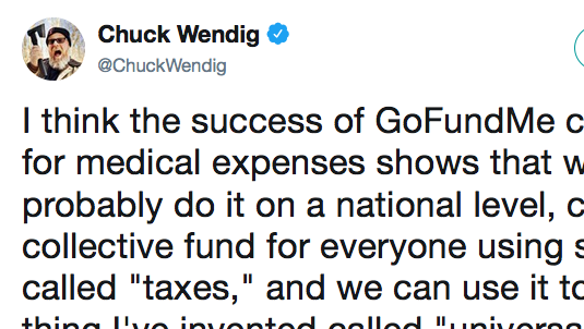 I think the success of GoFundMe campaigns for medical expenses shows that we could probably do it on a national level, creating a collective fund for everyone using something called "taxes," and we can use it to pay for a thing I've invented called "universal health care."