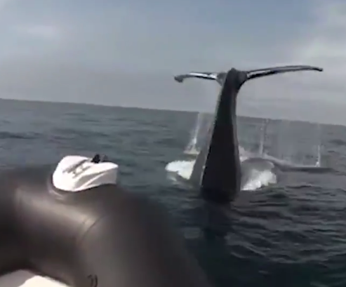 KEEP YOUR DISTANCE: A humpback whale made a surprise appearance off the coast of Nova Scotia, slapping an inflatable boat with its tail.