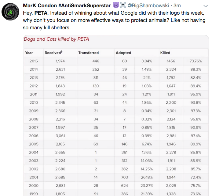 Hey, PETA. Instead of whining about what Google did with their logo this week, why don't you focus on more effective ways to protect animals? Like not having so many kill shelters. pic.twitter.com/5ggj4PpBKe
