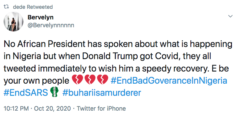 No African President has spoken about what is happening in Nigeria but when Donald Trump got Covid, they all tweeted immediately to wish him a speedy recovery. E be your own people 💔💔💔 #EndBadGoveranceInNigeria #EndSARS #buhariisamurderer