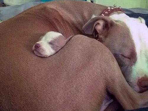 puppy sleeping with mom